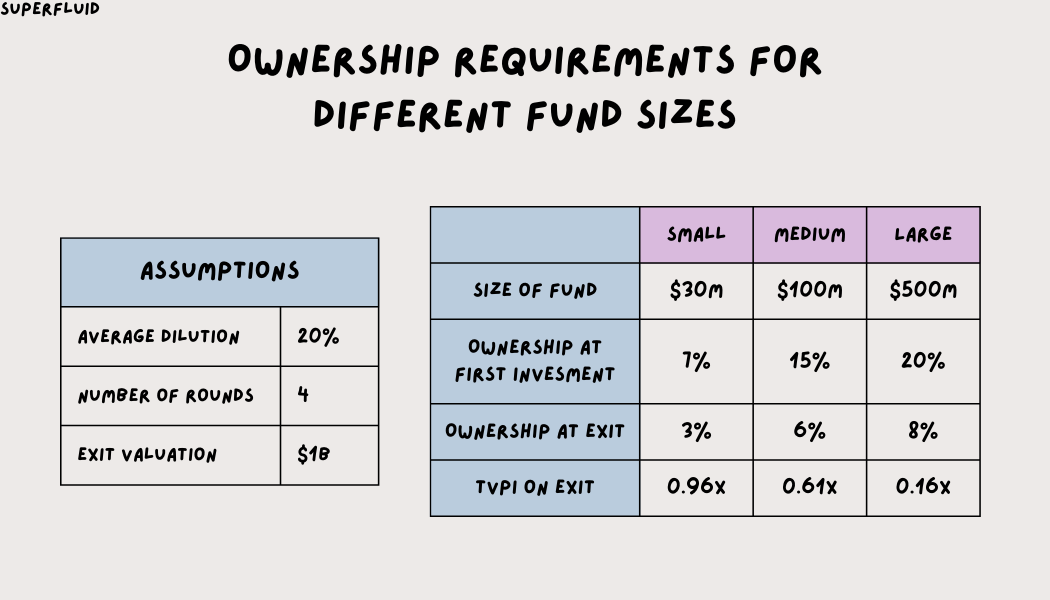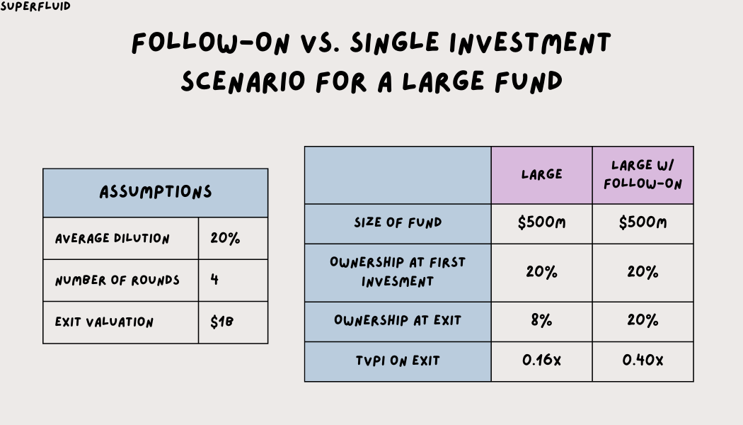 From the table on the right, you can clearly see that the small fund can basically return the fund with just 3% ownership at exit. On the other hand, the large fund can only return 16% of the fund with 8% ownership at exit. In reality, a large fund will maintain its pro-rata as long as possible and negate the impact of dilution.