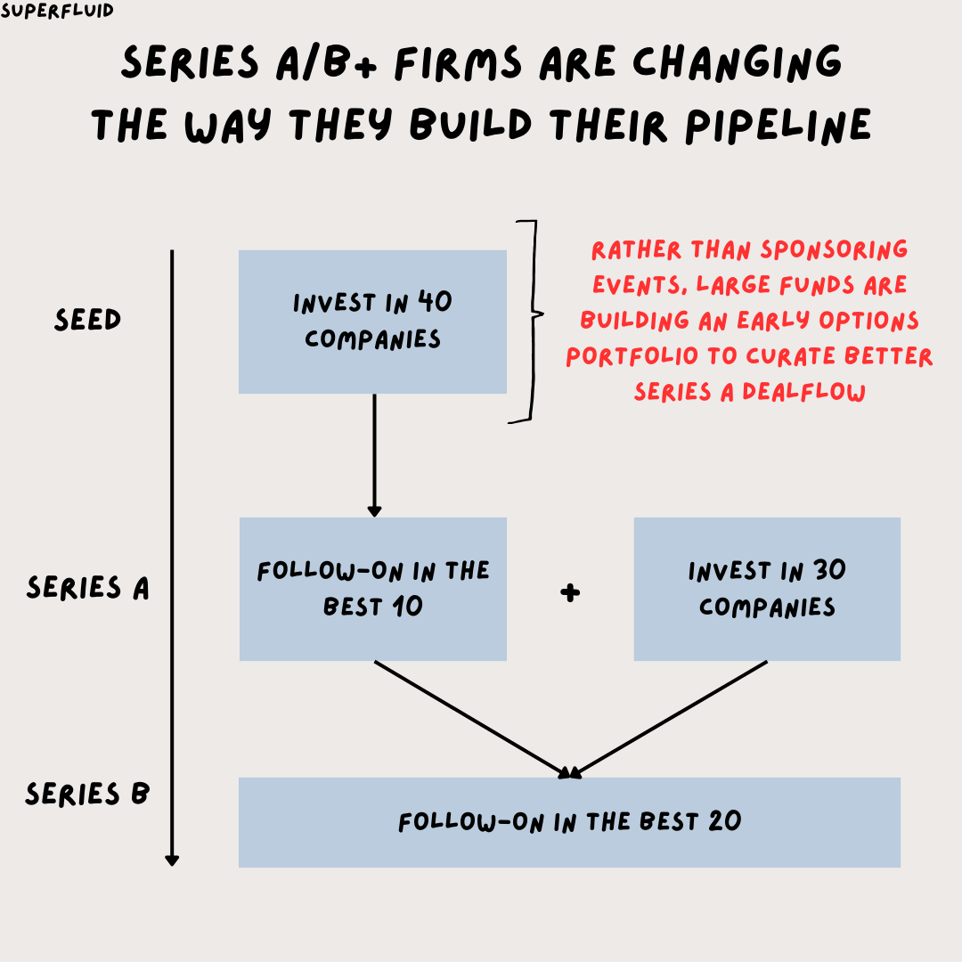 And so, instead of leading Seed rounds with $5M cheques, this particular fund is following into Seed rounds with cheques under $1M. These cheques are effectively meaningless in the context of the fund’s size, however, give them the opportunity to curate their pipeline better and deploy large Series A cheques into strong companies.